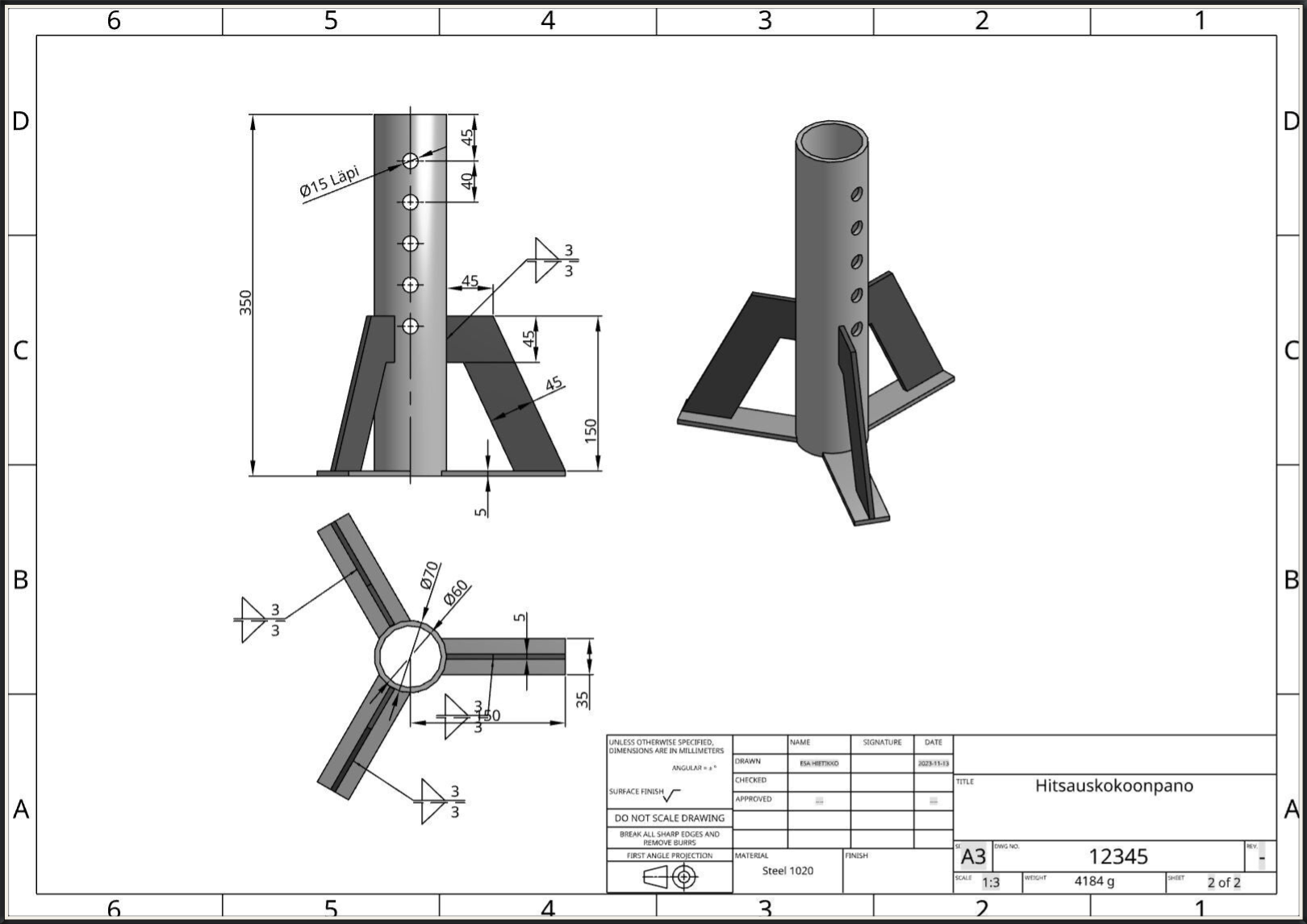 Laadi myös valmistus-, hitsaus- ja kokoonpanopiirustukset.