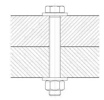 Kaksi levyä on kiinnitetty M20-ruuvilla kuvan mukaisesti. Ruuvia on kiristetty niin, että siinä vaikuttaa 50 kN:n voima. Kuinka suuri jännitys ruuvissa on? Mikä on varmuus myötöön nähden, jos ruuvin lujuusluokka on 8.8?