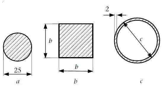 Kuvassa on esitetty kolme sauvan poikkipintaa. Jos sauvaan a vaikuttaa 5 kN vetovoima, kuinka suuri jännitys siihen syntyy? Mitkä pitäisi mittojen b ja c olla, jotta kahdessa muussa poikkipinnassa jännitykset olisivat yhtä suuret kuin poikkipinnassa a?
